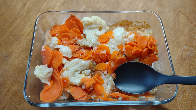 1. Place the Cauliflower & Carrots in a saucepan and boil at a medium heat for about 20 minutes.