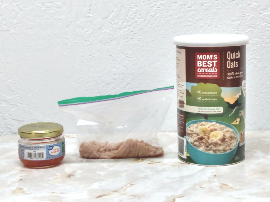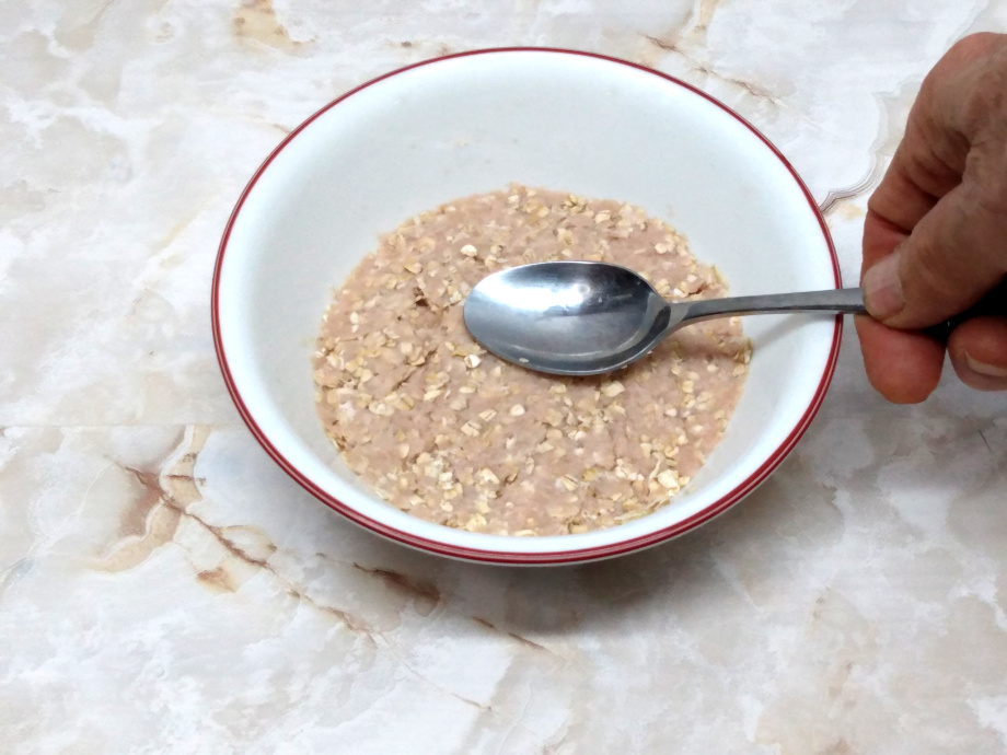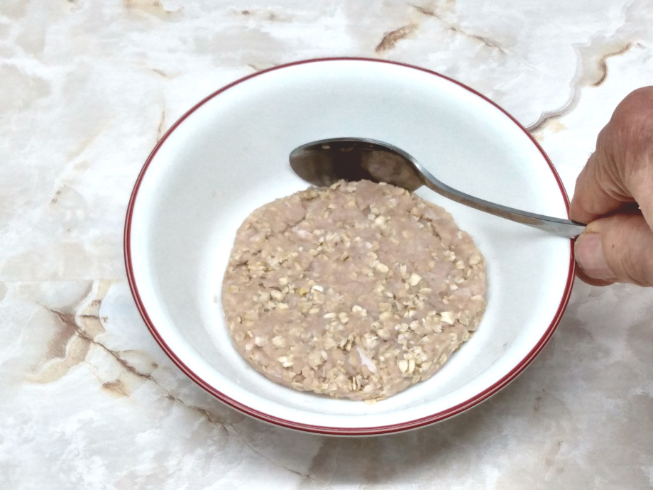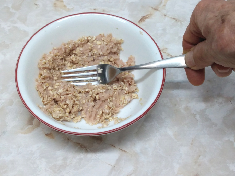 I blend the oats and chicken with a fork. The fork pushes the oats into the chicken better.