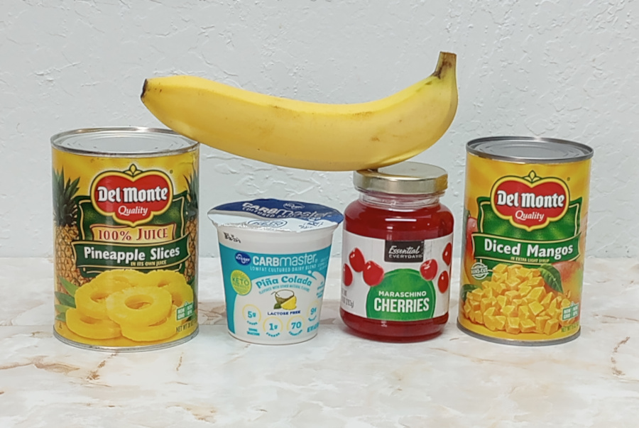 INGREDIENTS:Kroger Carbmaster Piña Colada Lowfat Yogurt, 4 table spoons diced mango, half a small banana & one pineapple slice